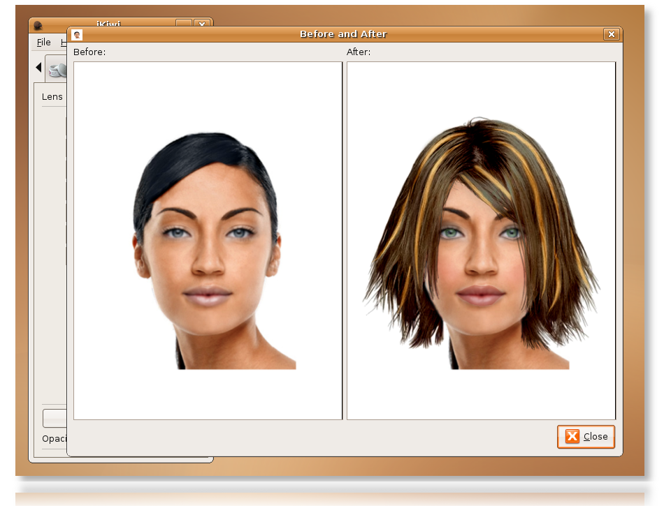 jKiwi est un logiciel libre, spécialement conçu pour le montage photo dans l'esthétique : changement de coiffure, la maquillage, blush, rouge à lèvre, …