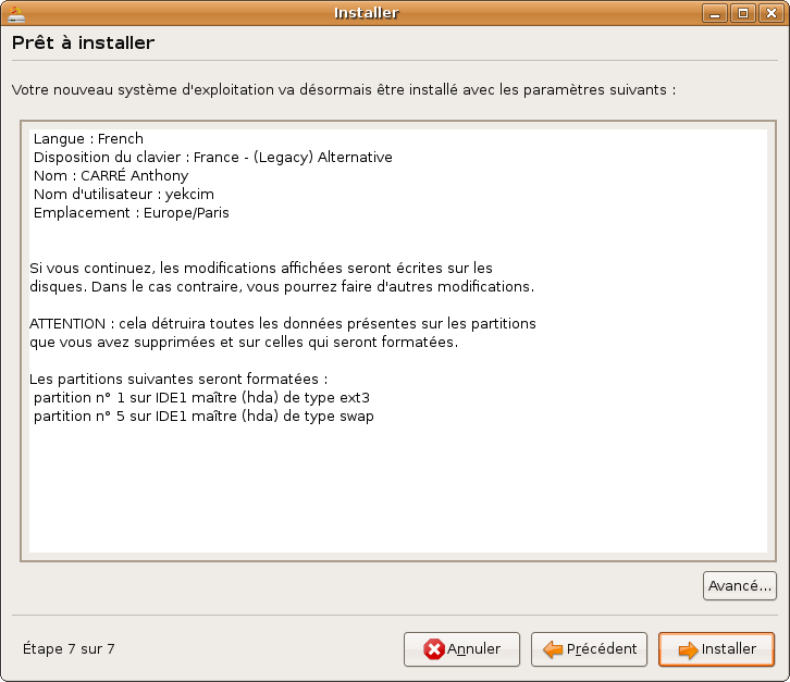 Lorsque le résumé des opérations à effectuer s'affiche (fenêtre intitulée "Prêt à installer"), au bas de la fenêtre d'installation, cliquez sur le bouton Avancé… (voir image ci-dessous). Indiquez qu'il faut installer le chargeur d'amorçage et précisez que celui-ci doit se trouver dans l'emplacement (hd0,1) ou sélectionnez le périphérique /dev/sda2 dans le menu déroulant5). Si vous laissez le paramétrage par défaut, le tatouage de votre ordinateur sera effacé. Veillez donc à entrer les bons paramètres.